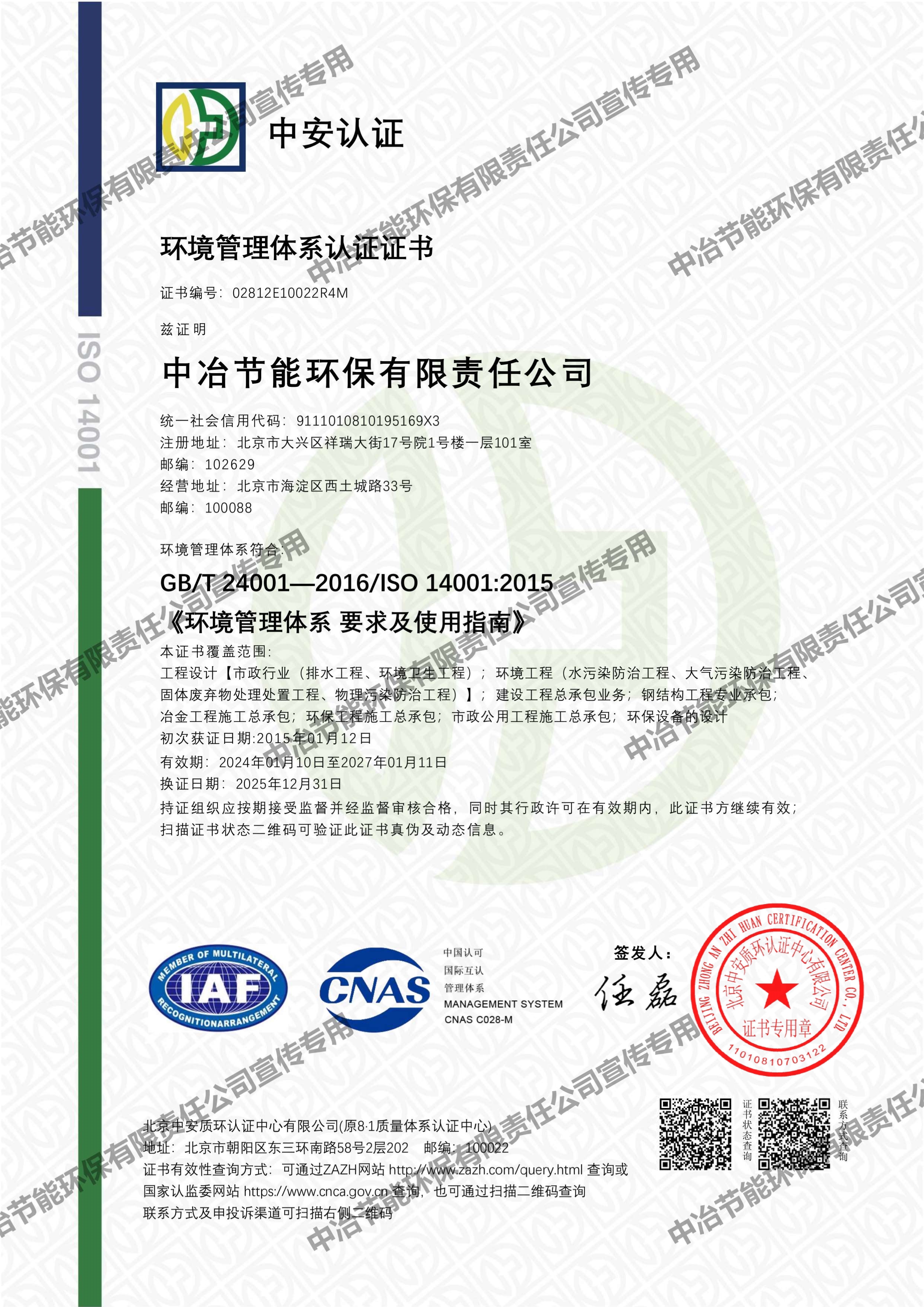 環(huán)境管理體系認(rèn)證證書